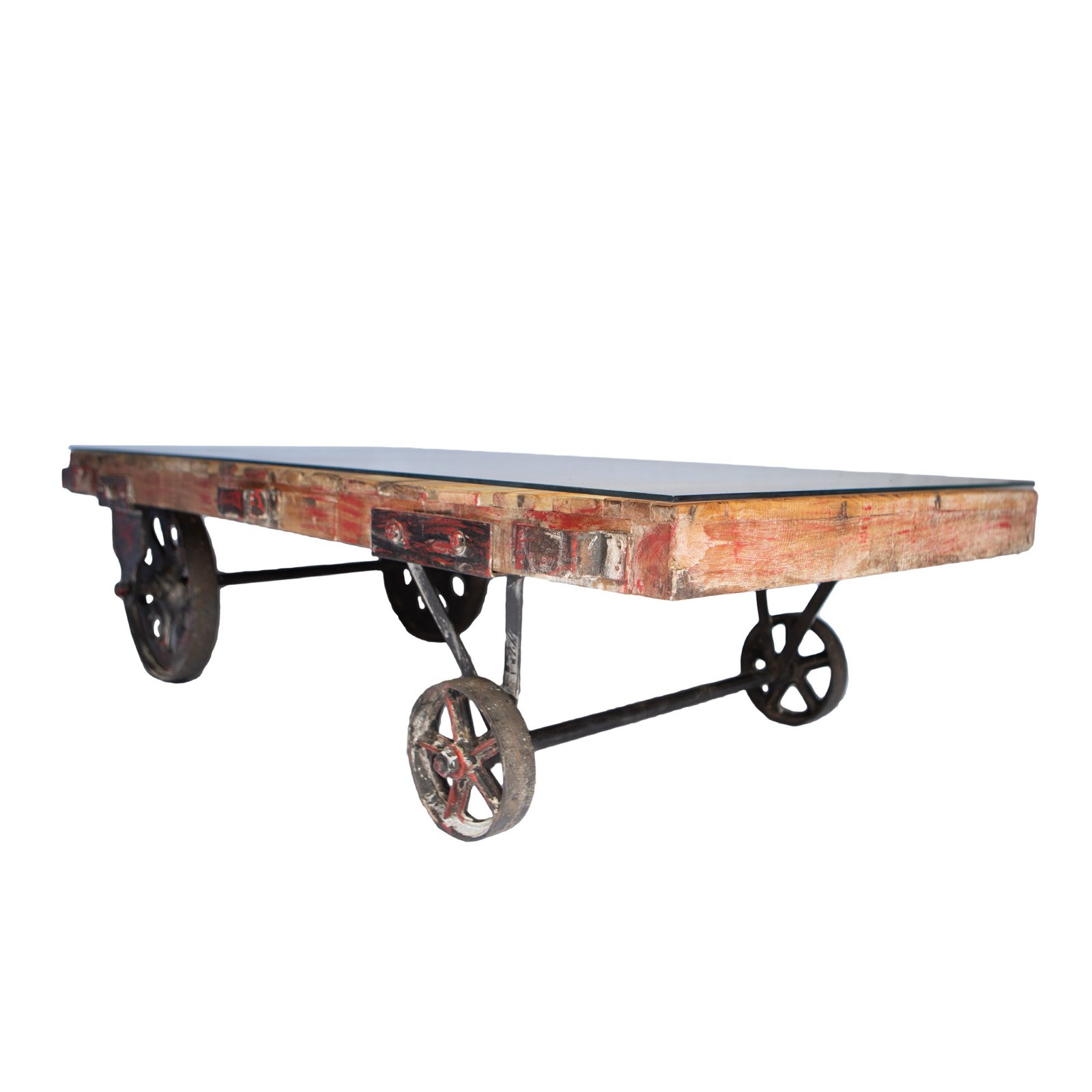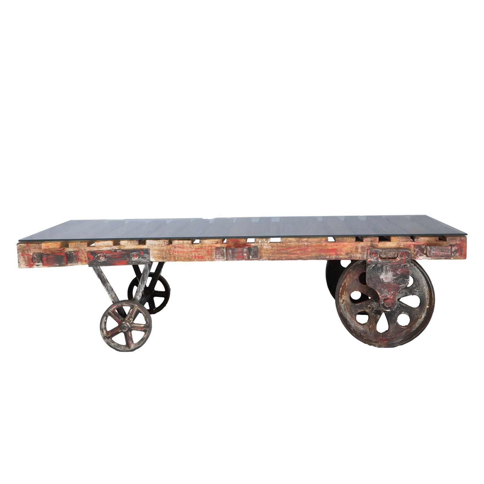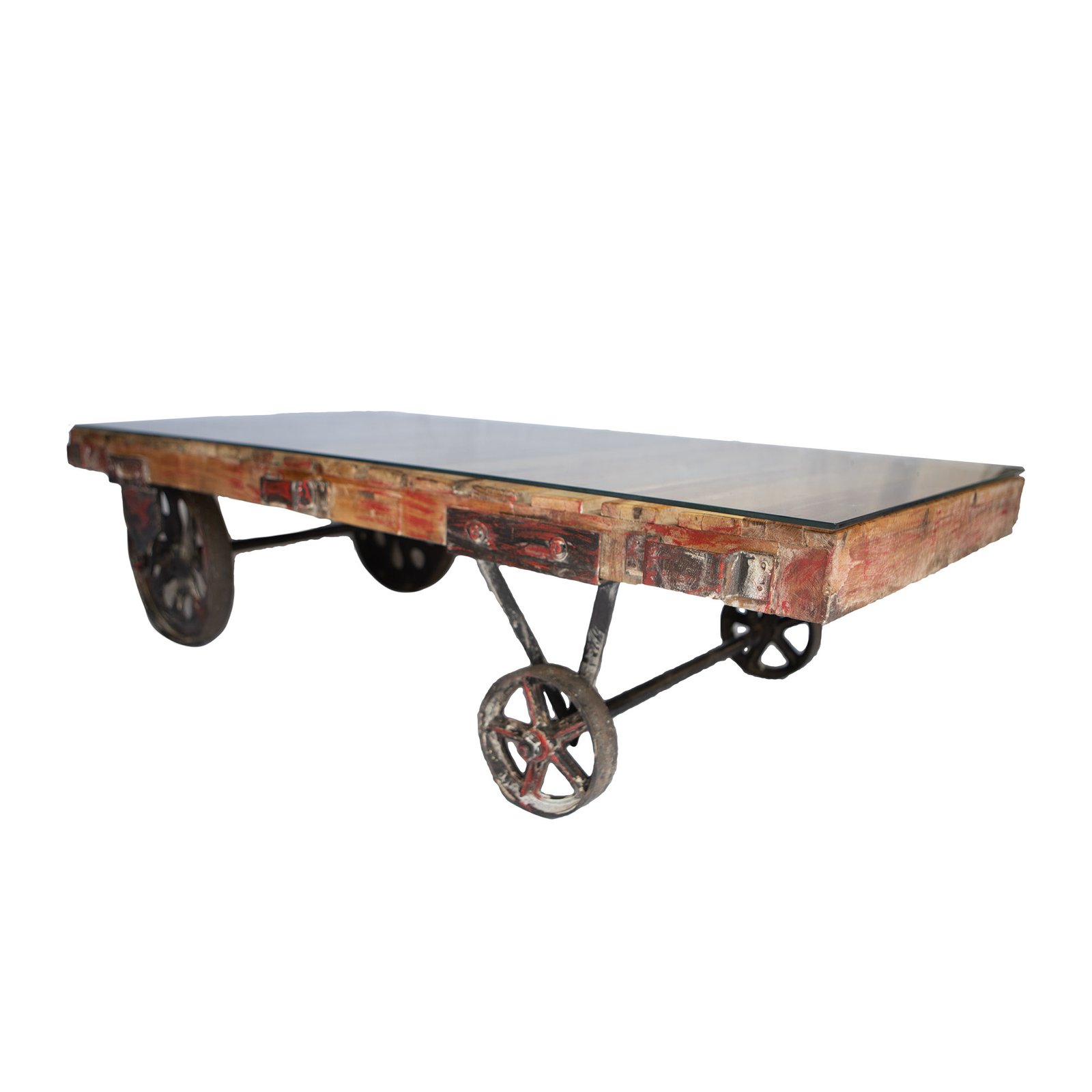 Couchtisch aus recycelten Holzlatten, mit Eisenrädern. Großer und schwerer Tisch, rollbar, Holz stellenweise mit Farbresten. Inklusive Glasplatte, die lose auf den Holzlatten aufliegt. Es gibt insgesamt sechs vorgefertigte Schraublöcher in den jeweiligen Holzlatten, in die z.B. Gummiträger als Schrauben eingeschraubt werden können, um die Glasplatte rutschsicher auf diese und nicht direkt auf die Holzlatten zu legen. Die Gummiträger gehören nicht zum Angebotsumfang.