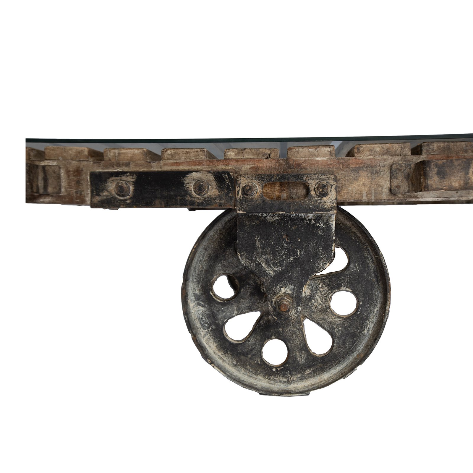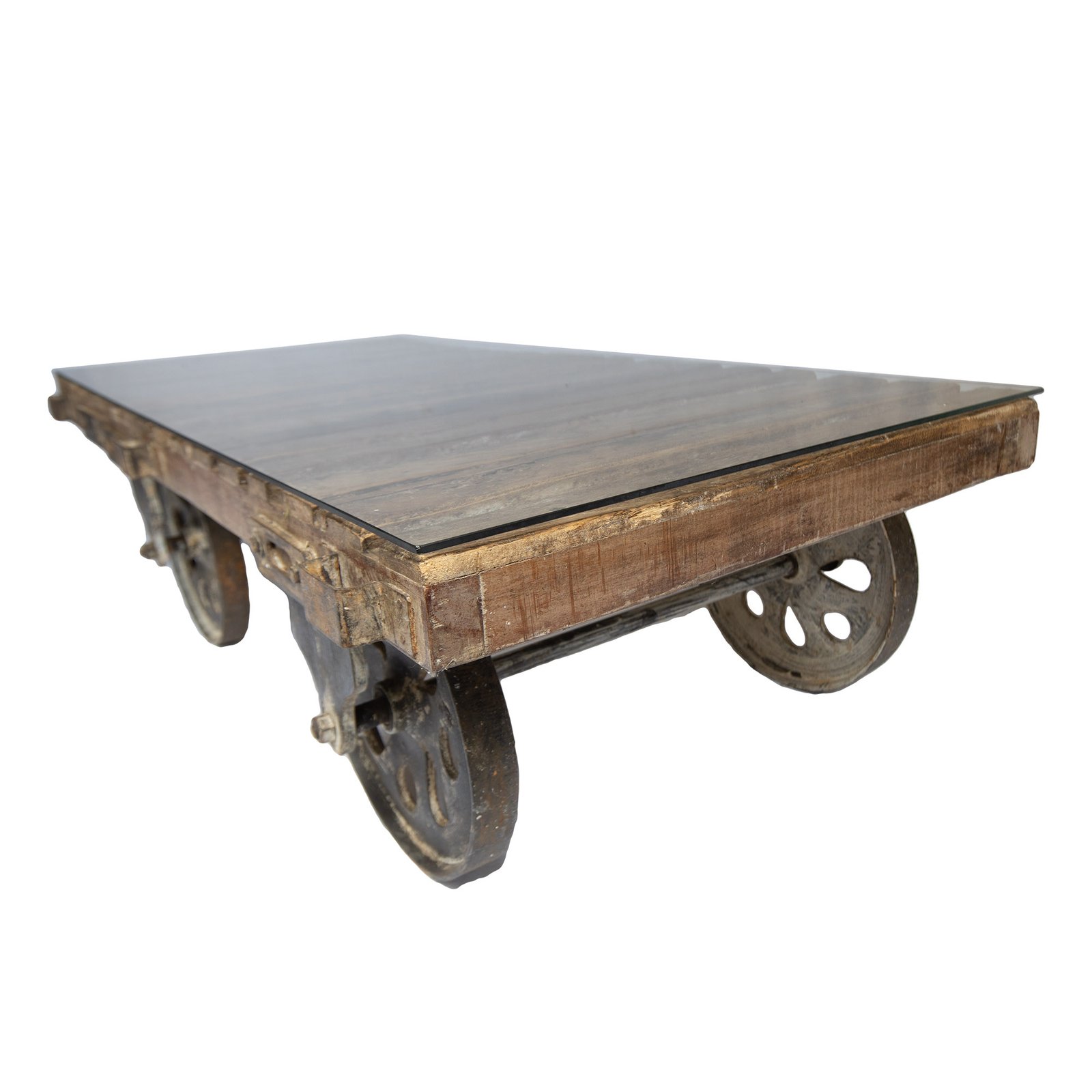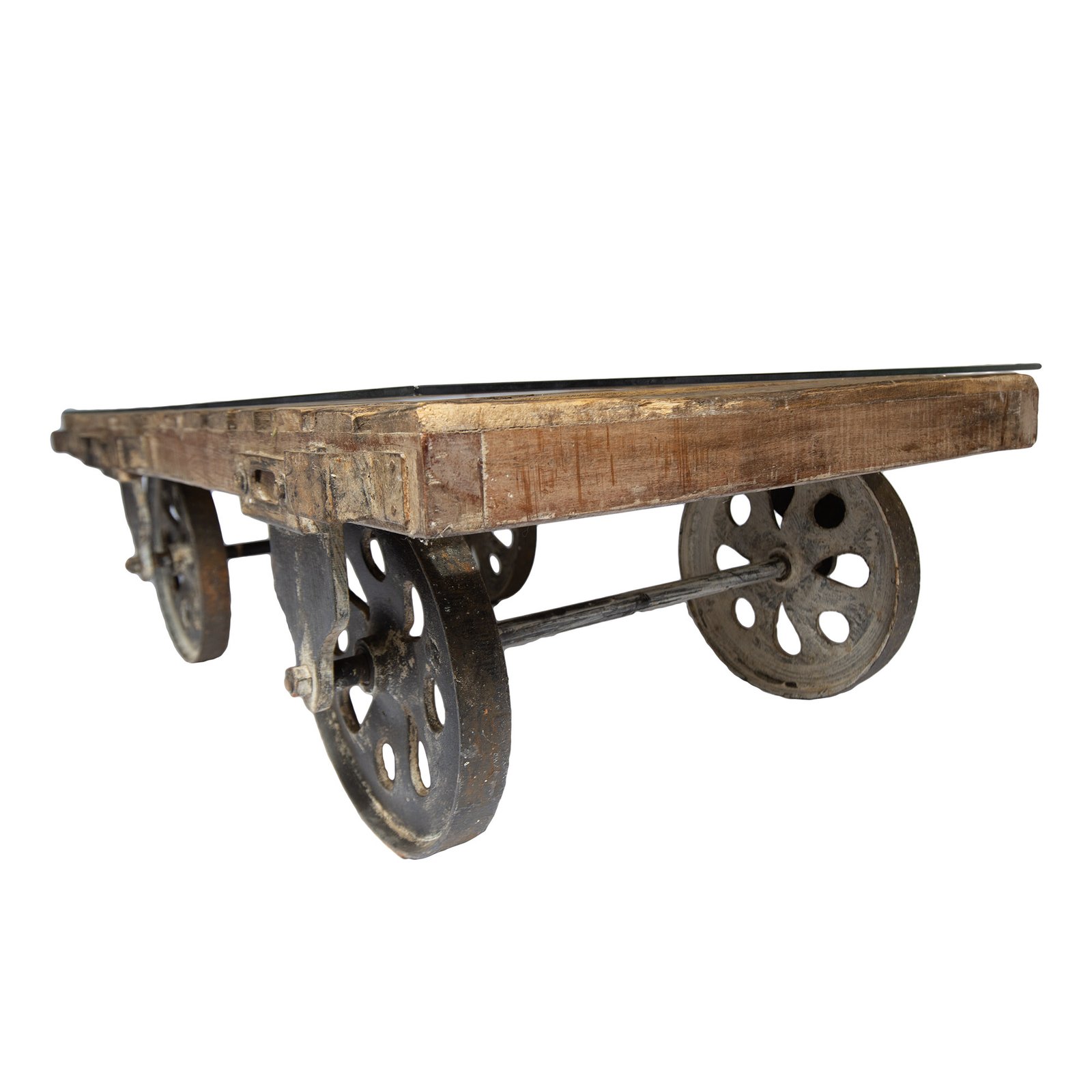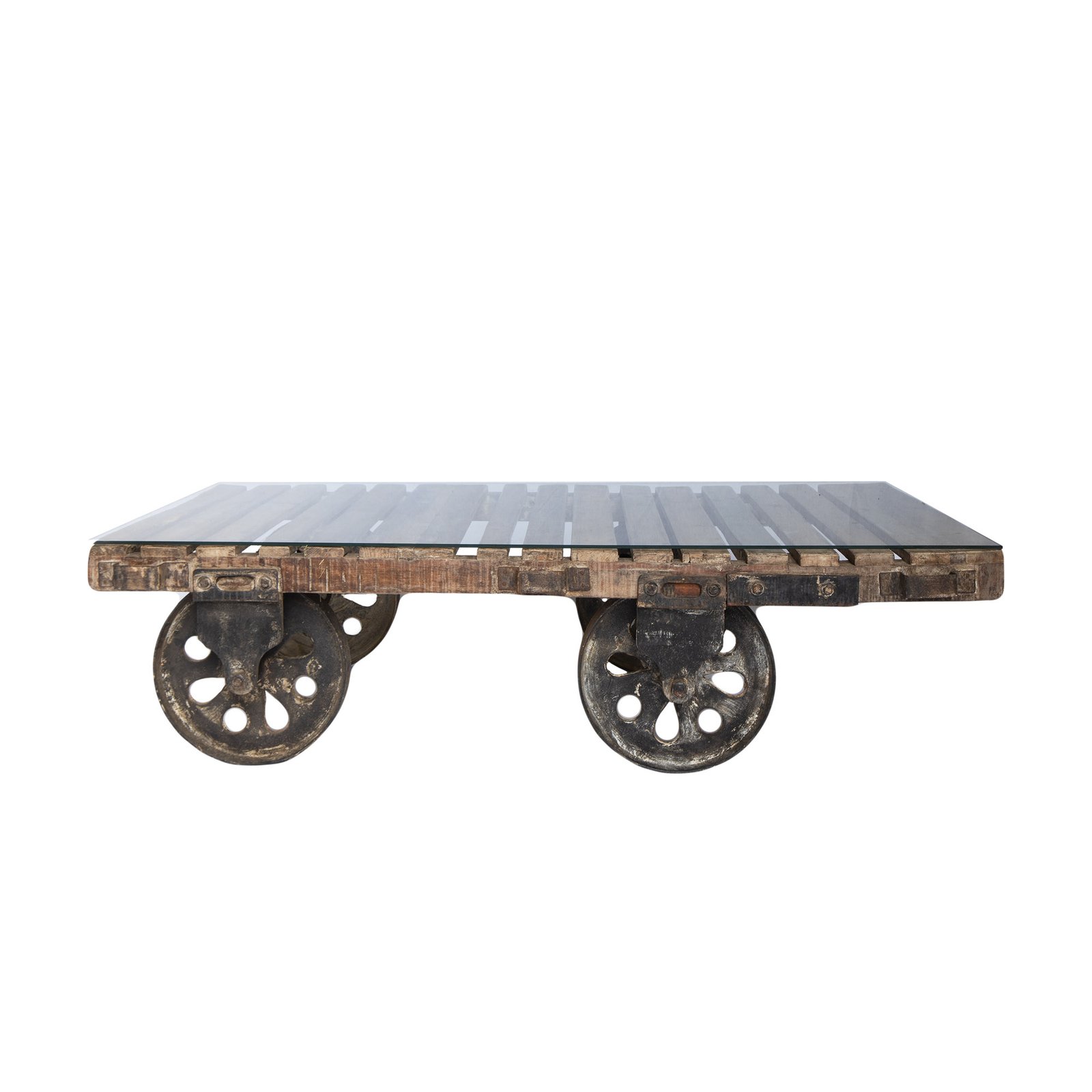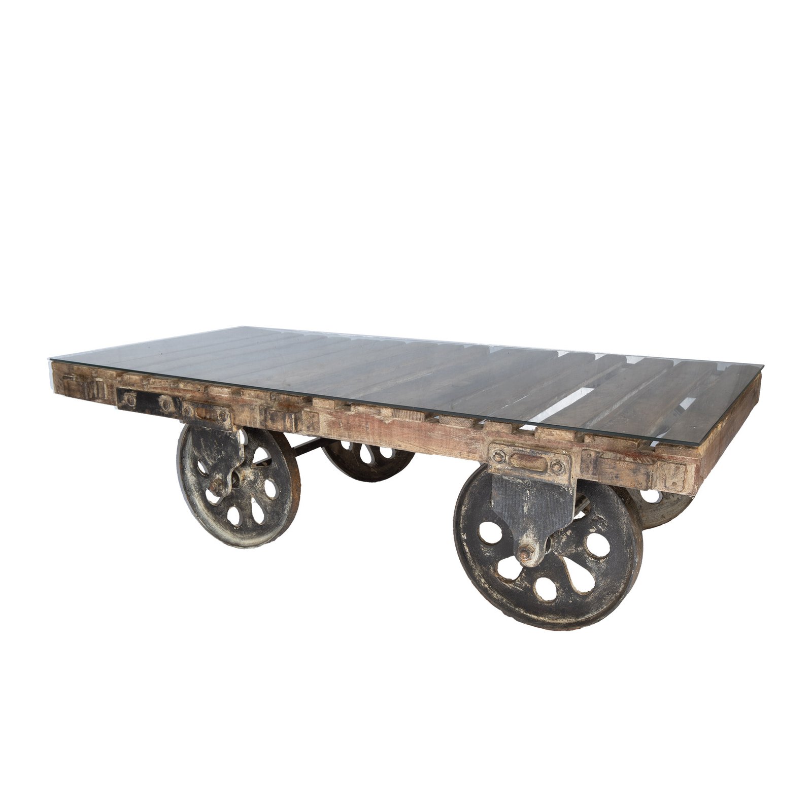 Couchtisch aus recycelten Holzlatten, mit Eisenrädern. Großer und schwerer Tisch, rollbar, stellenweise noch Farbreste vorhanden. Inklusive Glasplatte, die lose auf den Holzlatten aufliegt. Es gibt insgesamt sechs vorgefertigte Schraublöcher in den jeweiligen Holzlatten, in die z.B. Gummiträger als Schrauben eingeschraubt werden können, um die Glasplatte rutschsicher auf diese und nicht direkt auf die Holzlatten zu legen. Die Gummiträger gehören nicht zum Angebotsumfang.
