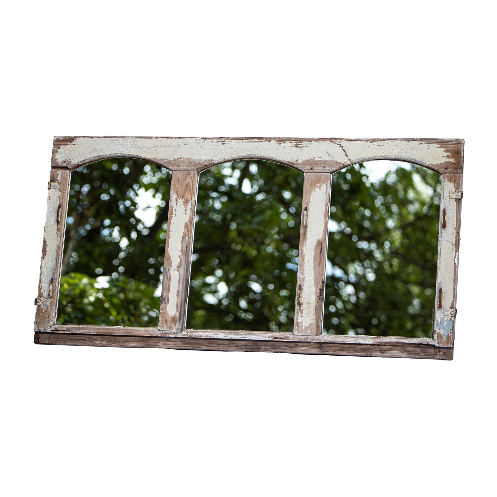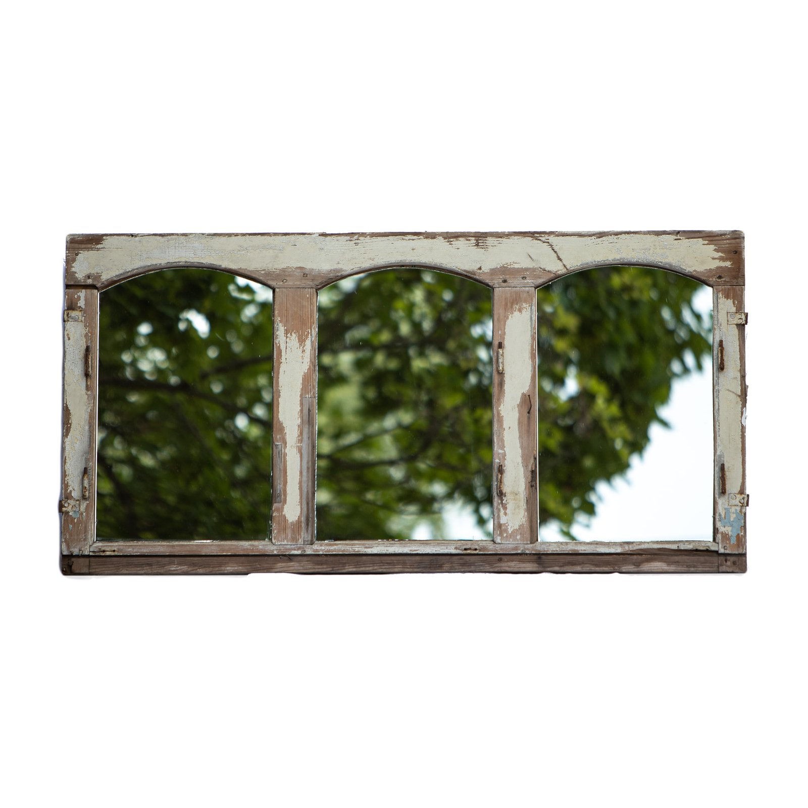 Dreiteiliger großer Spiegel aus einem alten und schweren Fensterholzrahmen. Mit Farblackresten am Rahmen. Die rechteckigen Spiegelfelder sind von vorne mit sichtbaren kleinen Nägeln am Holzrahmen fixiert. Die Schnittkanten des Spiegelglases sind dadurch sichtbar. Einzelstück. Leichte Farbabweichungen im Vergleich zu den Produktbildern möglich.